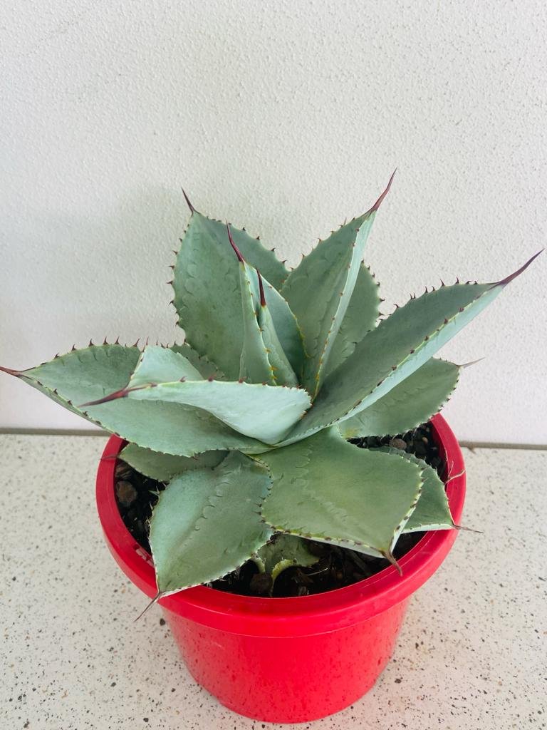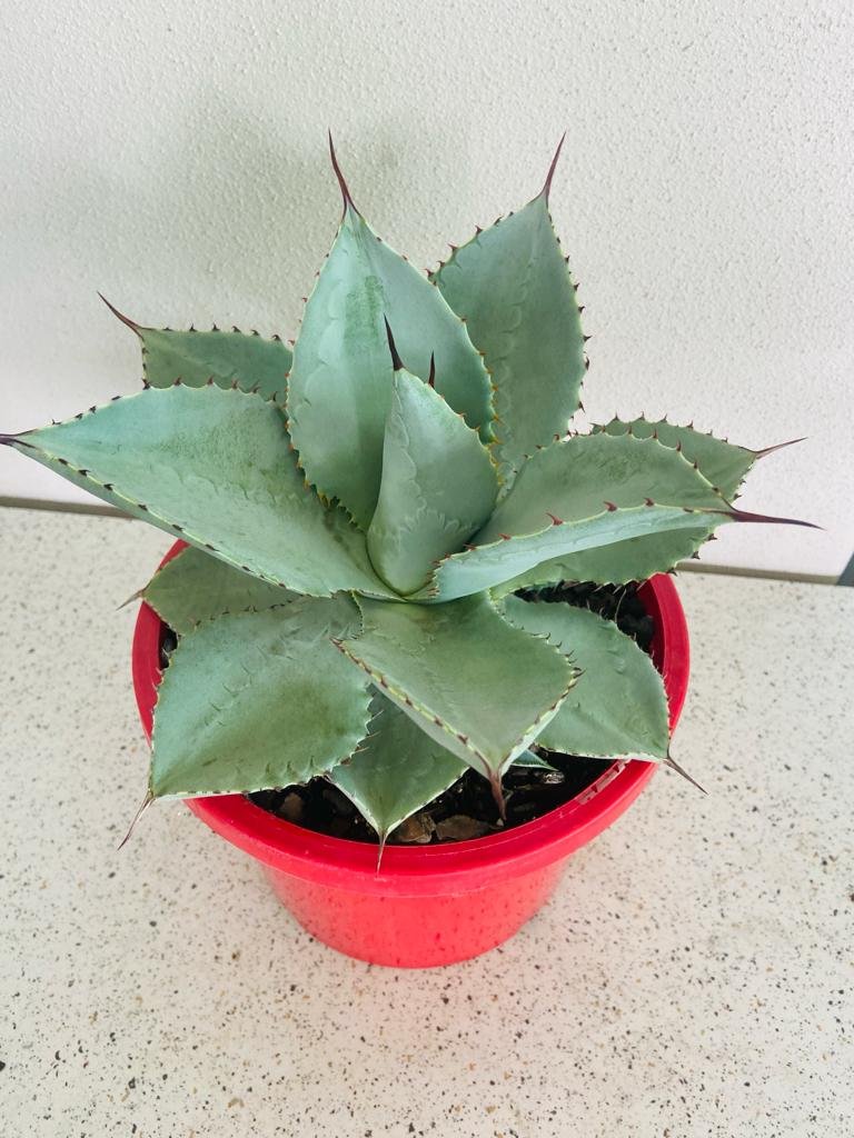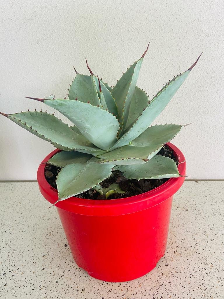 Agave ‘Dragon Toes’ is a compact and striking hybrid agave prized for its bold, sculptural form and easy-care nature. It forms neat rosettes of thick, fleshy, blue-green leaves with prominent reddish margins and small terminal spines that give the plant its fierce “dragon-like” character.