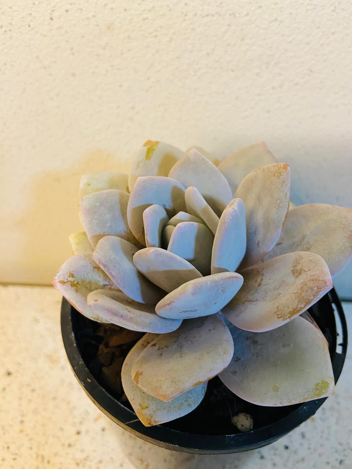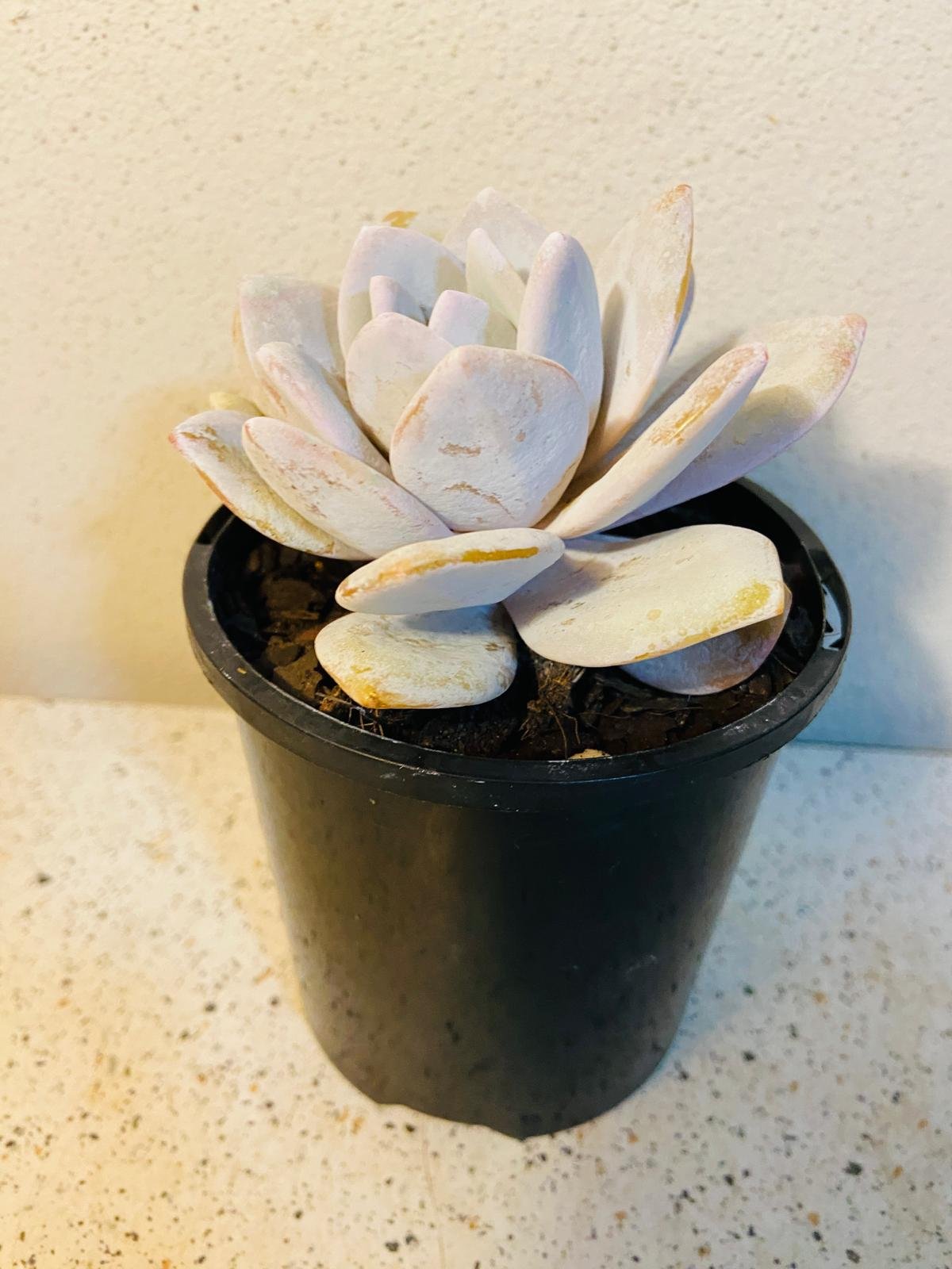 Ghostly White Perfection: The thick, fleshy leaves are covered in a fine, powdery coating called farina, giving them a soft, velvety texture and a unique pale hue, reminiscent of a delicate ghost.