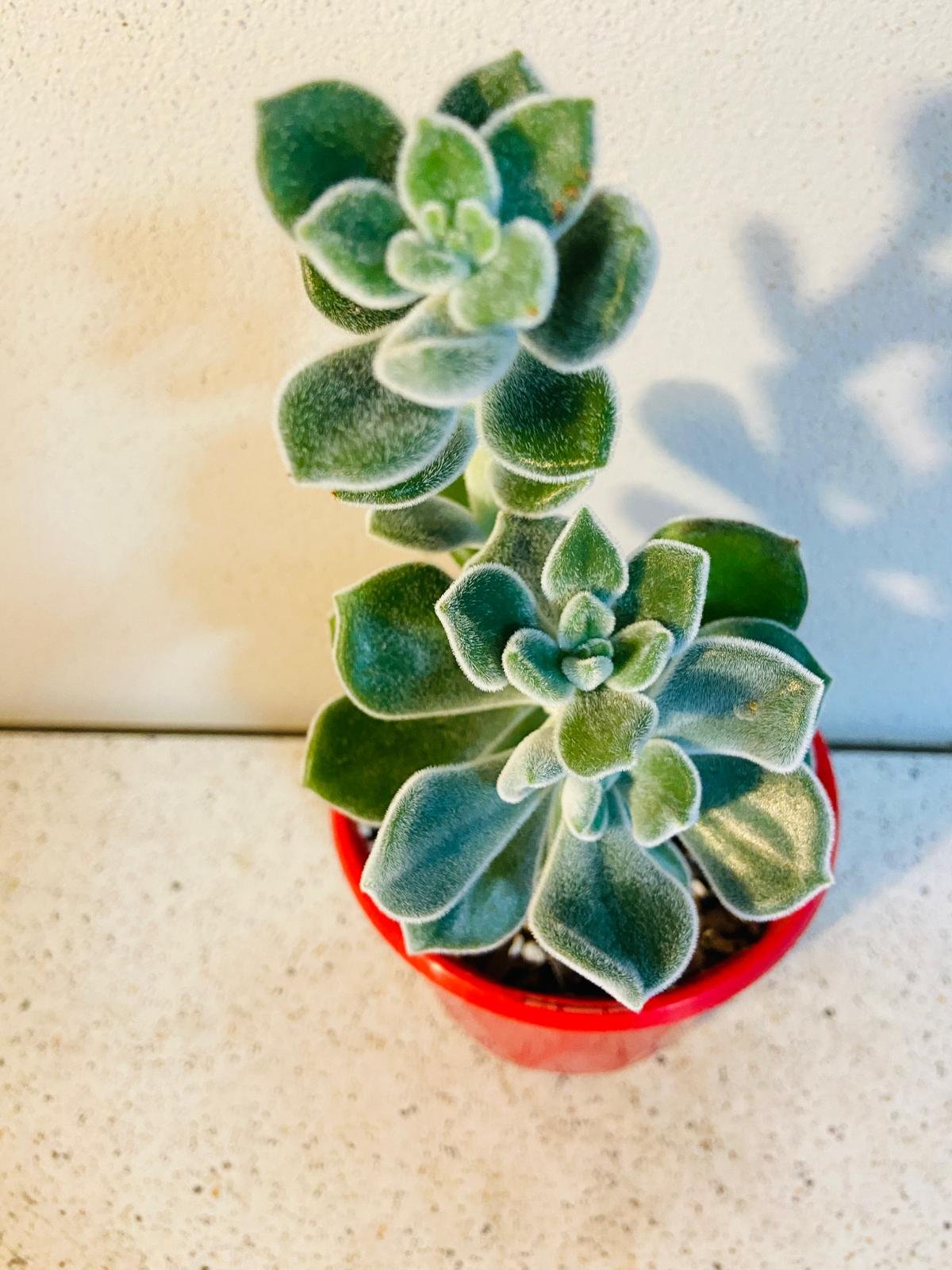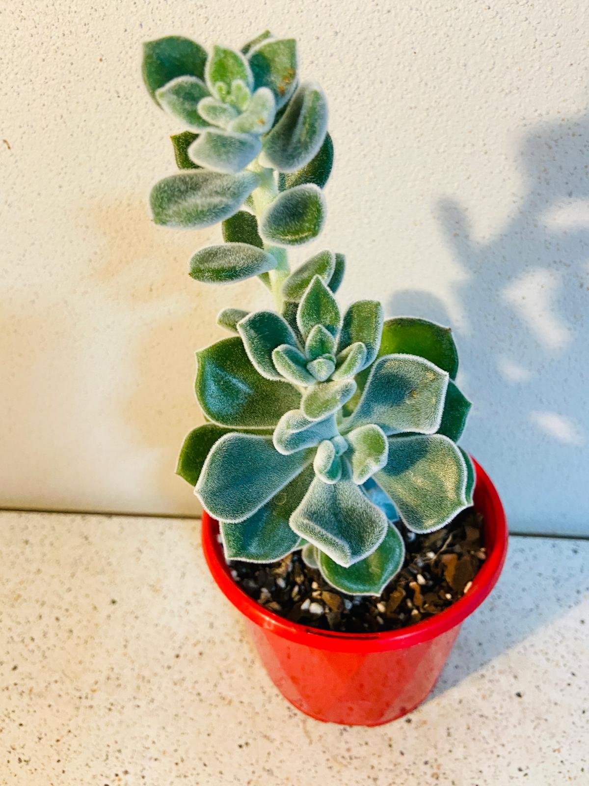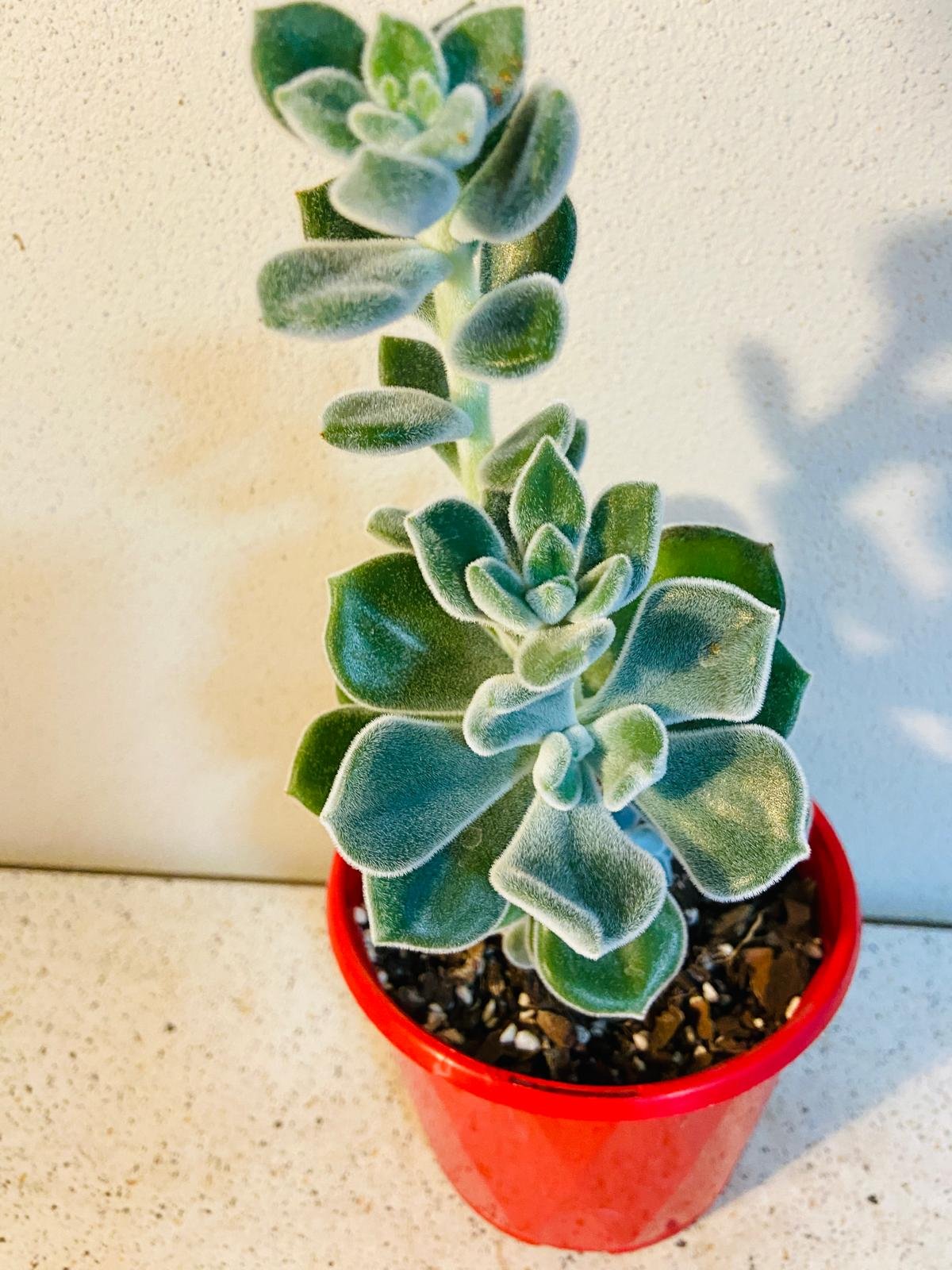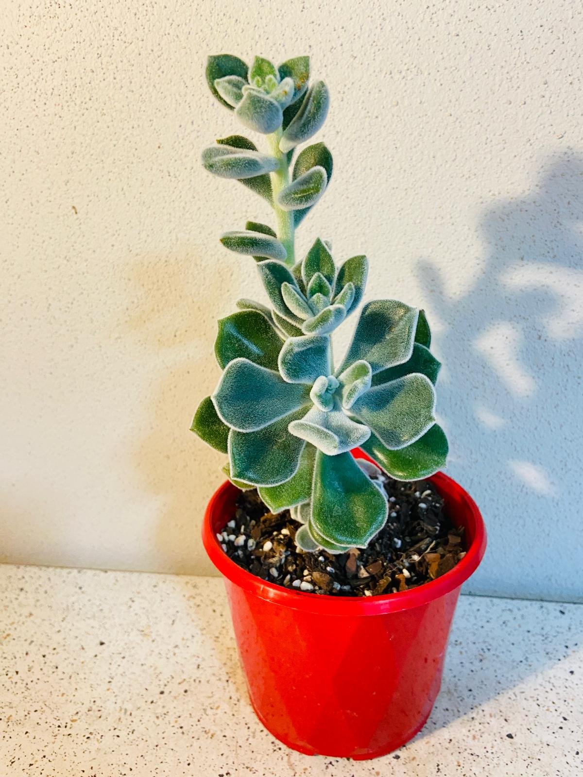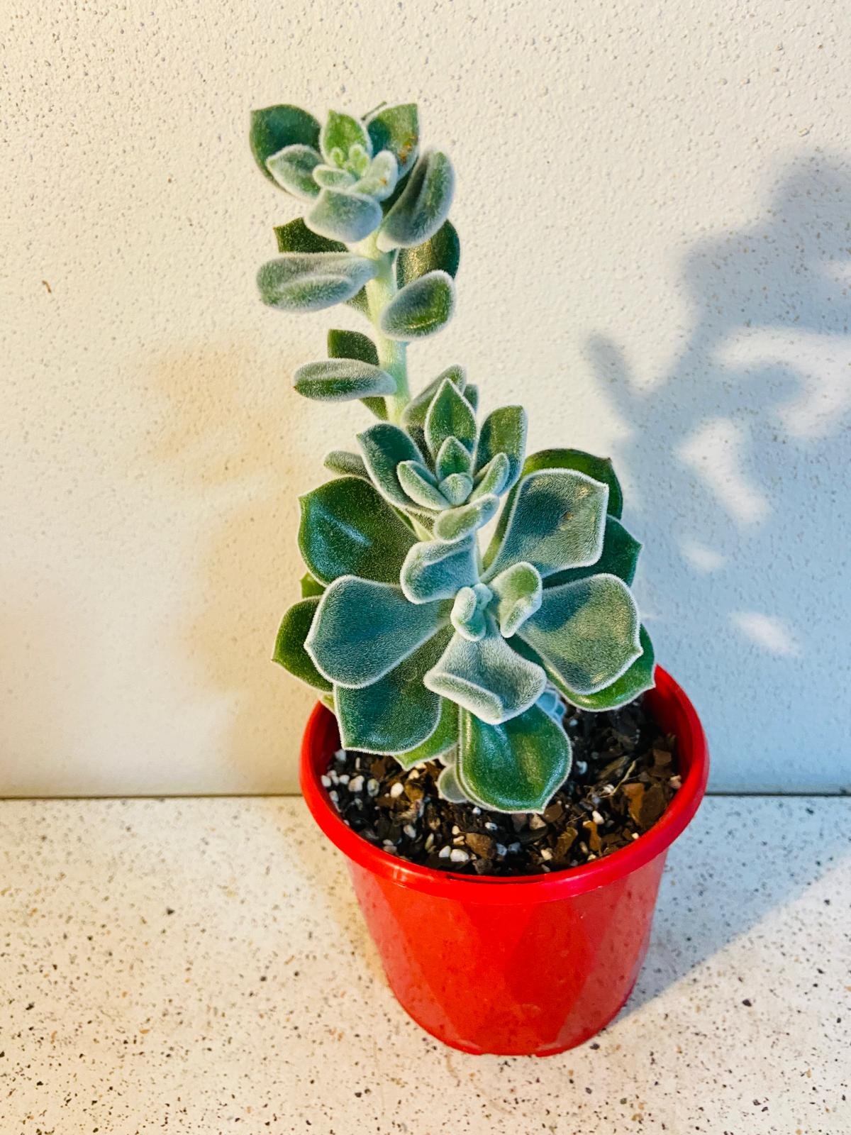 Echeveria pulvinata 'Frosty' is a soft, velvety succulent with silvery-green leaves densely covered in tiny white hairs. Its thick, oval-shaped leaves give it a plush, frosted appearance, hence the name. During blooming season, it produces bright orange-red, bell-shaped flowers on tall stems, adding a vibrant contrast to its cool-toned foliage.