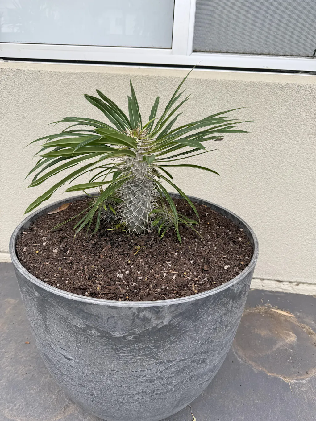 - Tall, sculptural succulent with a spiny trunk and palm-like leaves