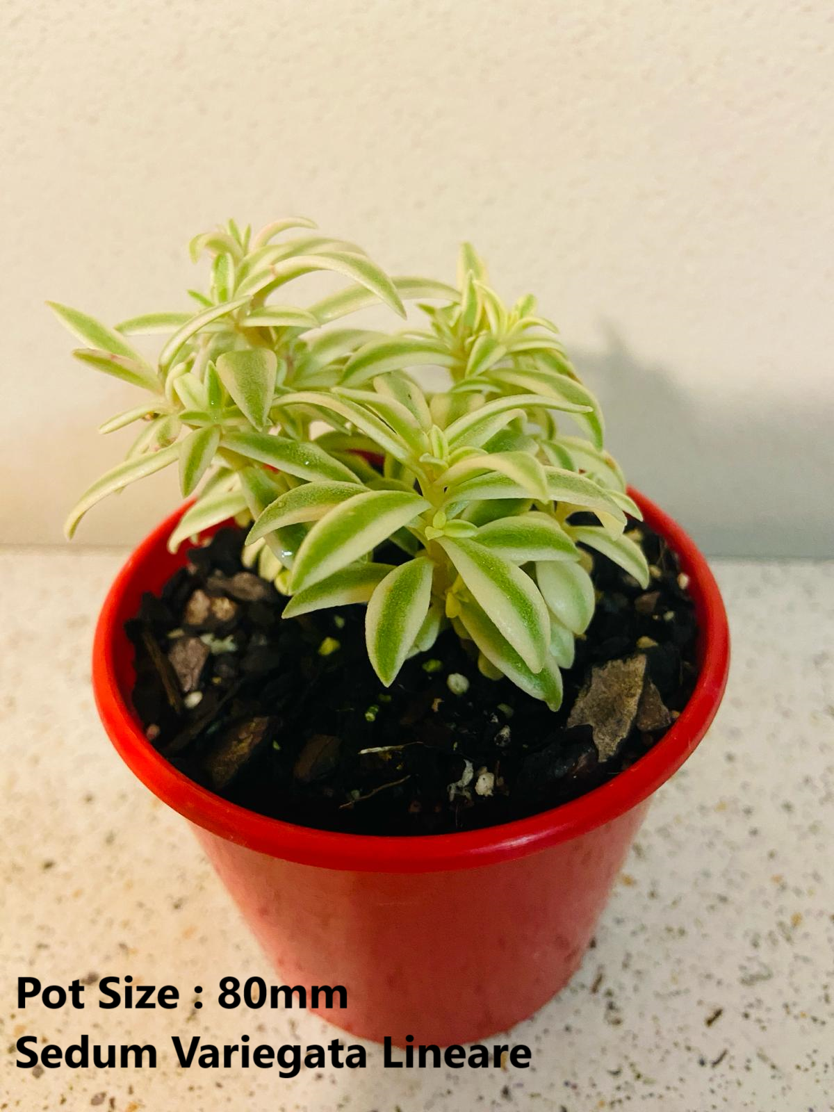 Sedum Variegata Lineare :Sedum lineare 'Variegatum,' also known as Carpet Sedum or Creeping Stonecrop, is a delightful, low-growing succulent admired for its delicate variegated foliage and cascading growth habit.This Sedum is known for its trailing or creeping growth habit, making it an excellent choice for ground cover, hanging baskets, or cascading over walls and containers.