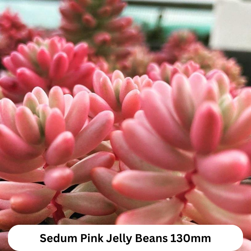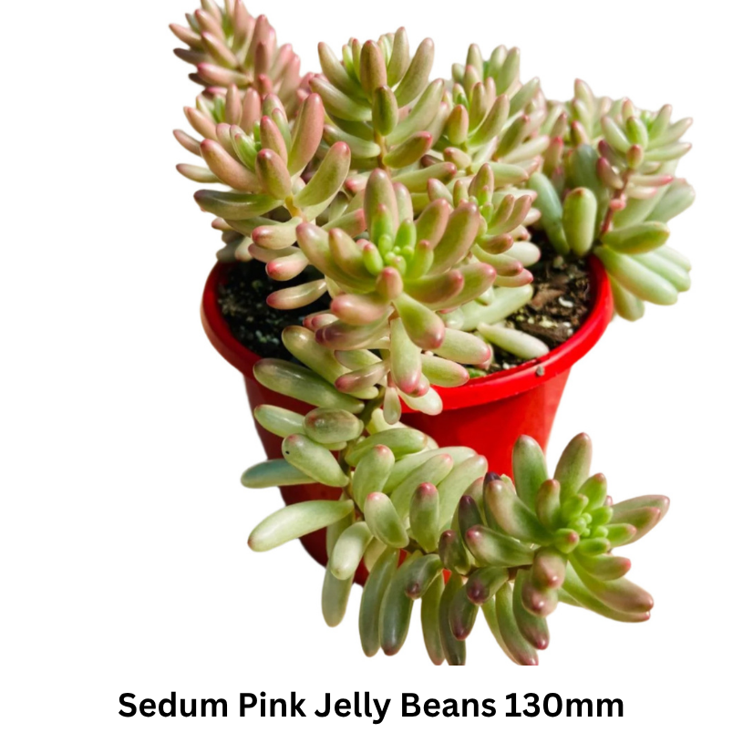 Sedum Pink Jelly Beans -130mm : Sedum Pink Jelly Beans, also known as Sedum rubrotinctum 'Aurora,' is a charming and eye-catching succulent that belongs to the Crassulaceae family. It's a low-growing, trailing succulent that forms dense clusters or mats. Sedum Pink Jelly Beans is a versatile succulent that looks fantastic in rock gardens, hanging baskets, or as a ground cover.