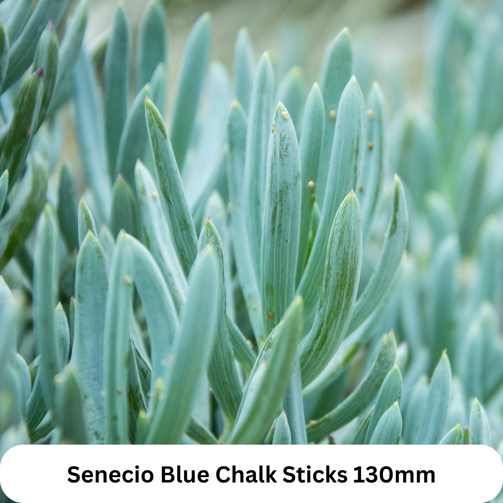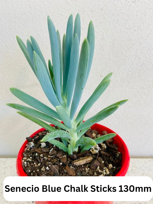 Senecio Blue Chalk Sticks-130mm: Senecio Blue Chalk Sticks is a striking, low-maintenance succulent known for its cool-toned, powdery blue foliage and upright, finger-like growth. Ideal for borders, rock gardens, or container arrangements, this drought-tolerant plant forms dense, trailing clumps that add sculptural texture and a modern aesthetic to any space. Thriving in full sun to part shade, it’s perfect for adding contrast and structure to succulent mixes or minimalist landscapes with minimal care.