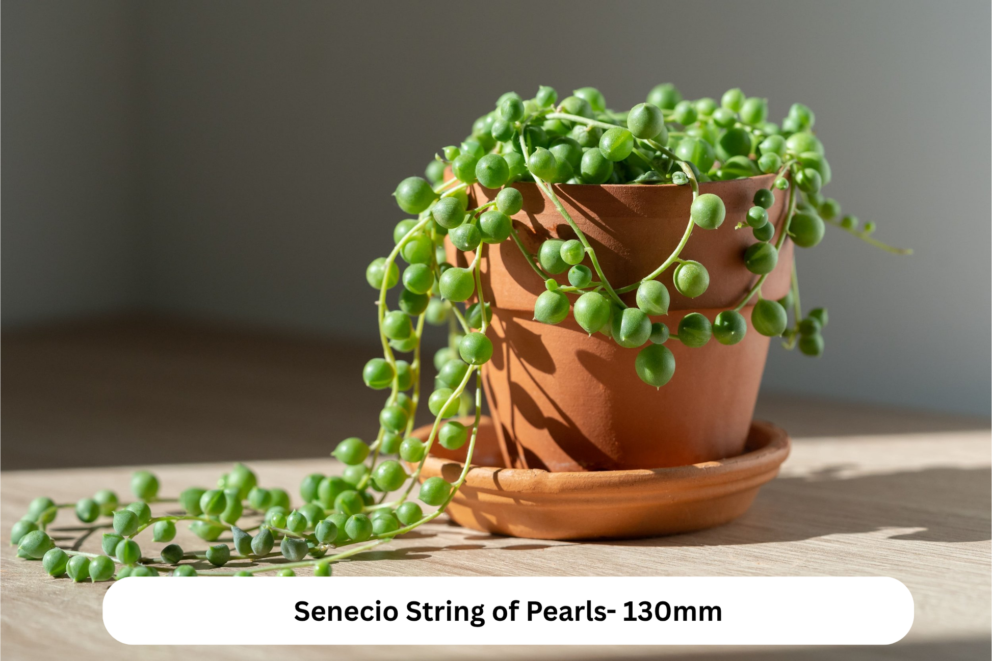 Senecio ‘String of Pearls’- 130mm: Senecio ‘String of Pearls’ is a striking trailing succulent known for its perfectly round, bead-like leaves that resemble a string of green pearls. Ideal for hanging baskets, shelves, or cascading over pots, this plant adds sculptural elegance and a modern touch to any space. Easy to care for and drought-tolerant, it thrives in bright, indirect light with infrequent watering, making it a favorite among both beginners and collectors.